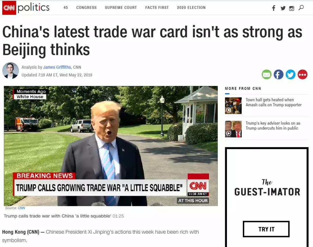 也有一些美國(guó)媒體沒那么悲觀。CNN就發(fā)表了一篇評(píng)論,稱稀土這張“貿(mào)易戰(zhàn)牌”沒有想象的那么強(qiáng)大。