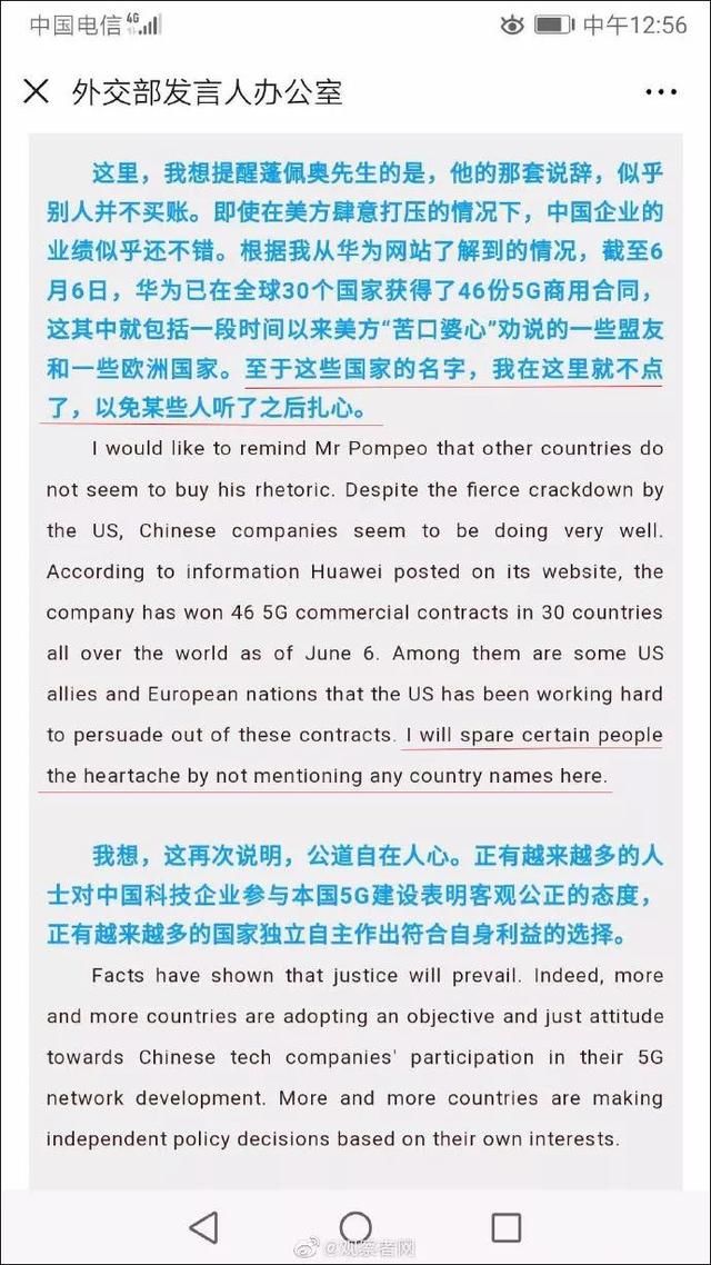 在外交部例行記者會上,發(fā)言人耿爽在回應關于“華為成績單”的問題時表示,截止到6月6日,華為公司已經(jīng)在全球30個國家獲得了46份5G商用合同,這其中就包括美方一段時間以來苦口婆心勸說的一些盟友和一些歐洲國家?!斑@些國家的名字這里我就不點了,以免某些人聽了之后扎心?!惫⑺f。